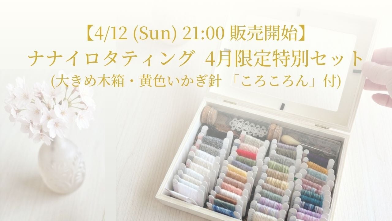 【4/12発売・限定3セット】 「今日は、何色で編もう?」 箱を開けた瞬間に、心がときめく50色の色彩。 ナナイロタティングの全50色のレース糸を、贅沢に詰め込んだ「糸の標本箱」ができました。 グラデーションに並んだ糸は、まるで宝石のようです。 ◆ 3セット限定の「スペシャルエディション」 今回のセットは、限定3セットのみの特別な贈り物。 タティングレースを思い切り楽しんでいただけるよう、「小さなかぎ針ころころん」と「デコレーションシャトルkasina」をセットにした、まさにスペシャルな内容です。 窓枠を彩る「額装レース」: 木箱の蓋の窓枠を、ナナイロタティングのレースでぐるりと一周、贅沢に縁取りました。 標本箱をひとつの「絵画」のように引き立てる、今回だけの特別デザインです。 特製・蓋付き木箱: 糸を使い終わった後も、あなたのかけがえのないコレクションBOXとして、一生お使いいただけます。 小さなかぎ針ころころん(8号レース針): 可愛らしいガラス瓶に入れてお届けします。 デコレーションシャトルkasina: 布の風合いを活かしたデコパージュ仕上げ。こちらもガラス瓶入りです。 ◆ このセットのポイント 「少しずつ、たくさん」を叶える: 1色10m巻(太糸は5m巻×2枚)をセットに。タティング、刺繍、縁飾り……あらゆる手仕事に、彩りを添えます。 そのまま飾れるコレクションBOX: 窓枠のレース越しに覗く50色の糸が、お部屋を彩る、世界にひとつだけのインテリアに。 3名様だけの特別プライス: 糸(17,500円相当)、特製木箱(800円)、ころころん(1,200円)、デコレーションシャトルkasina(2,000円)、レターパック送料、そして窓枠レース装飾。 これらを合わせると、総額22,000円を優に超える価値がございますが、今回は特別に【19,800円(送料無料)】でお届けします。 ◆ 内容詳細 レース糸50色(10m巻き45枚、5m×10枚) 窓枠レース装飾付き・特製木箱(1個) コルク蓋ガラス瓶(2個・小さなかぎ針ころころん、デコレーションシャトルkasina入り) 発送方法:レターパックにて、大切に梱包してお届けします。 ▷ ナナイロタティング教室とは 札幌にある、小さなタティングレース教室です。 「わからない・難しい」タティングを「楽しい!」にするお手伝いをしています。 日々の制作の様子やコツなどは、Instagramでも発信中。 ぜひチェックしてみてくださいね。 @nanairo_tatting