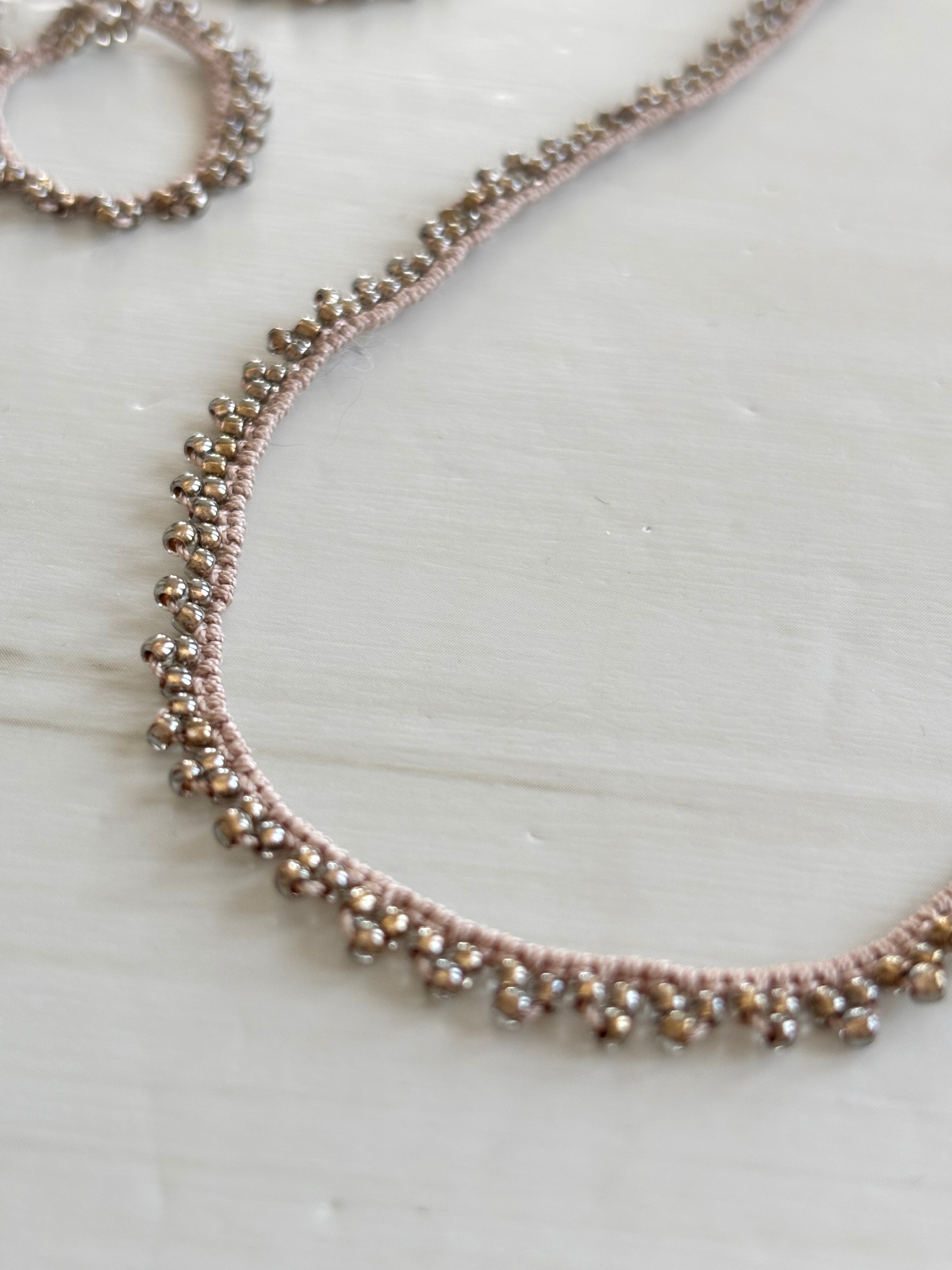 ビーズタティングコードのネックレスとイヤリングの材料と作り方をお届けします。おうちでゆっくり楽しんでいただけます。